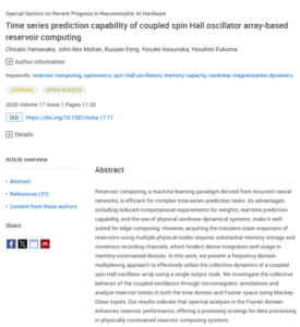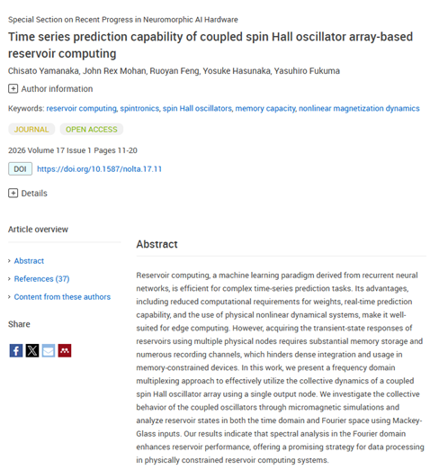 Our article “Time series prediction capability of coupled spin Hall oscillator array-based reservoir computing” published in Nonlinear Theory and Its Applications, IEICE.